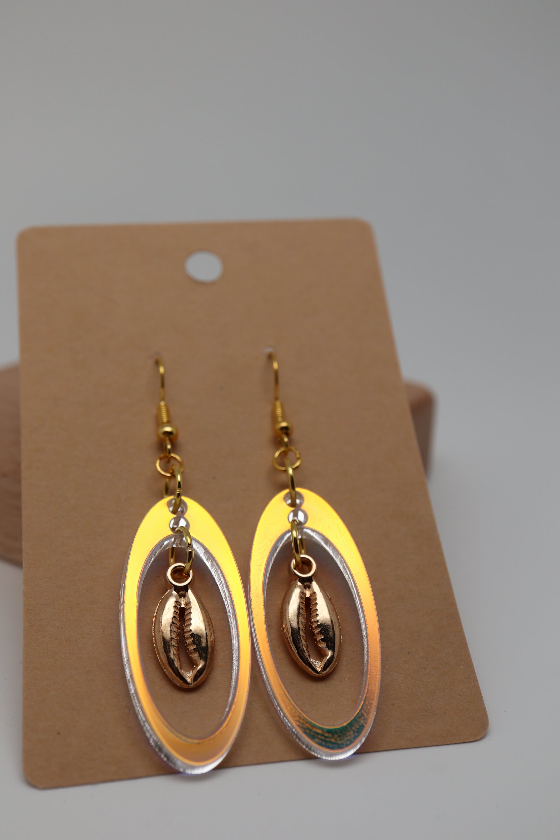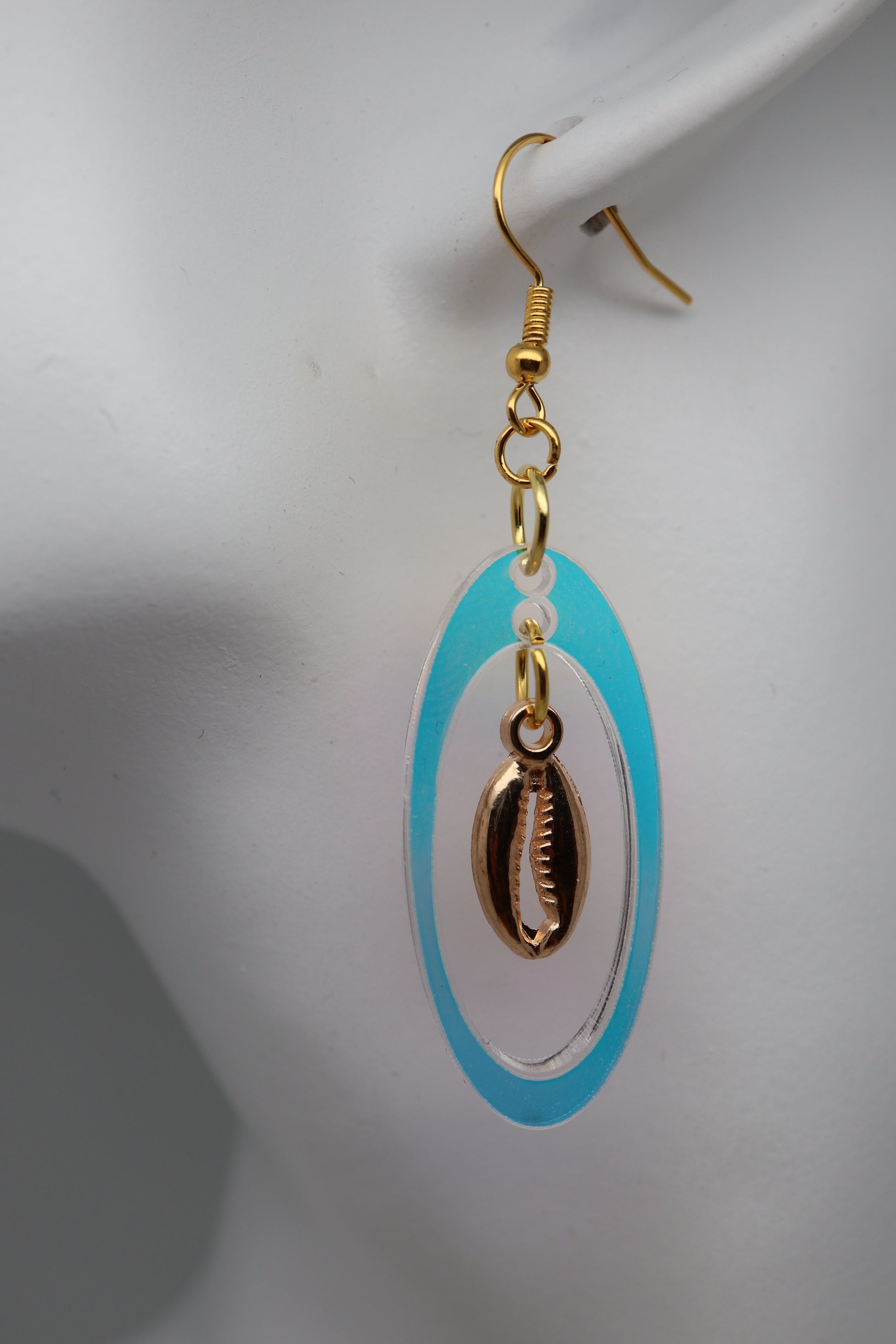 These dreamy iridescent acrylic loops shimmer between aqua, pearl, and soft rainbow tones ā like sunlight hitting clear ocean water. Inside, a polished gold coffee-bean charm hangs suspended, adding warmth, movement, and a tiny touch of cozy energy. āš