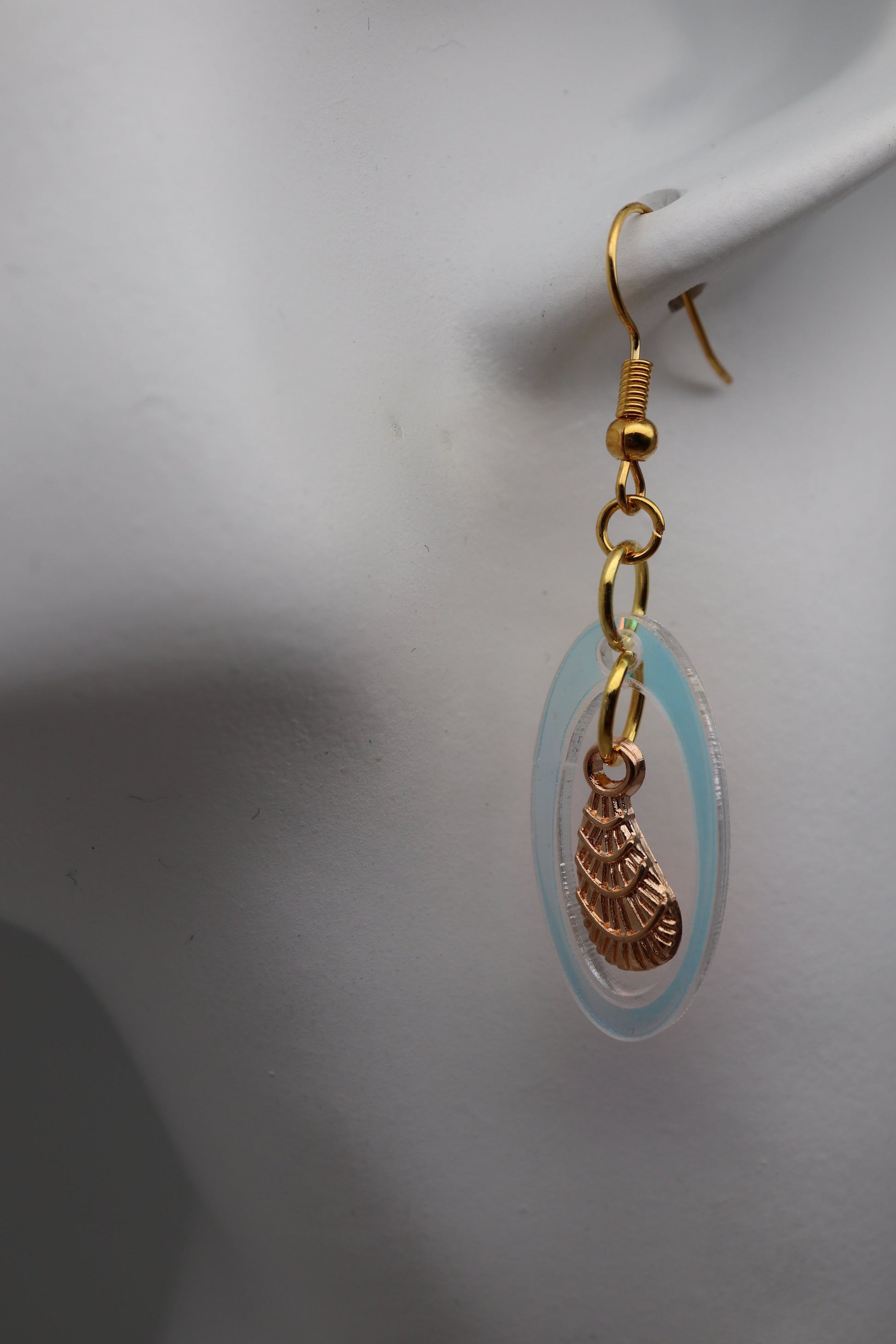 These shimmering iridescent acrylic loops glow with soft aqua, pearl, and rainbow flashes ā like catching sunlight through clear ocean water. Hanging in the center is a polished gold seashell charm, adding warm, beachy energy to the cool, dreamy glow. šāØ