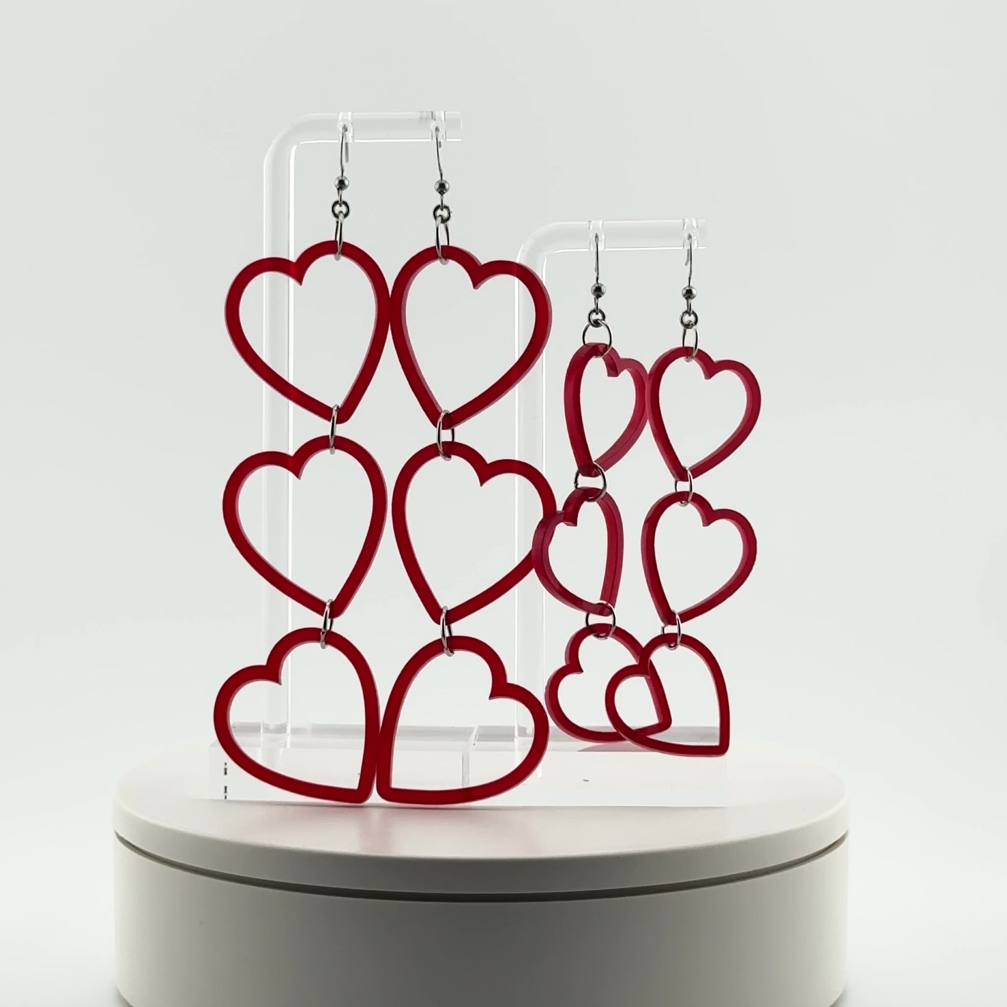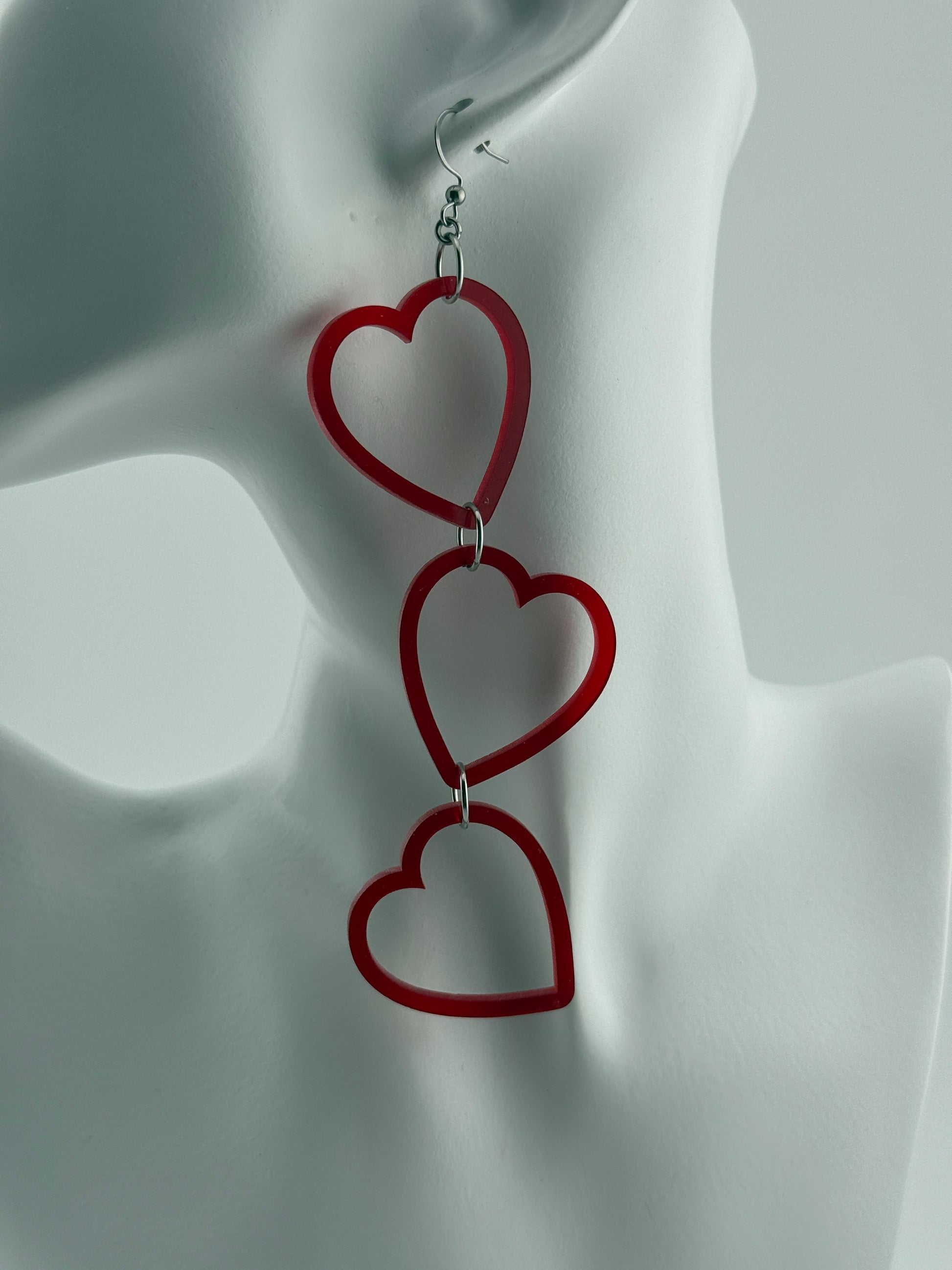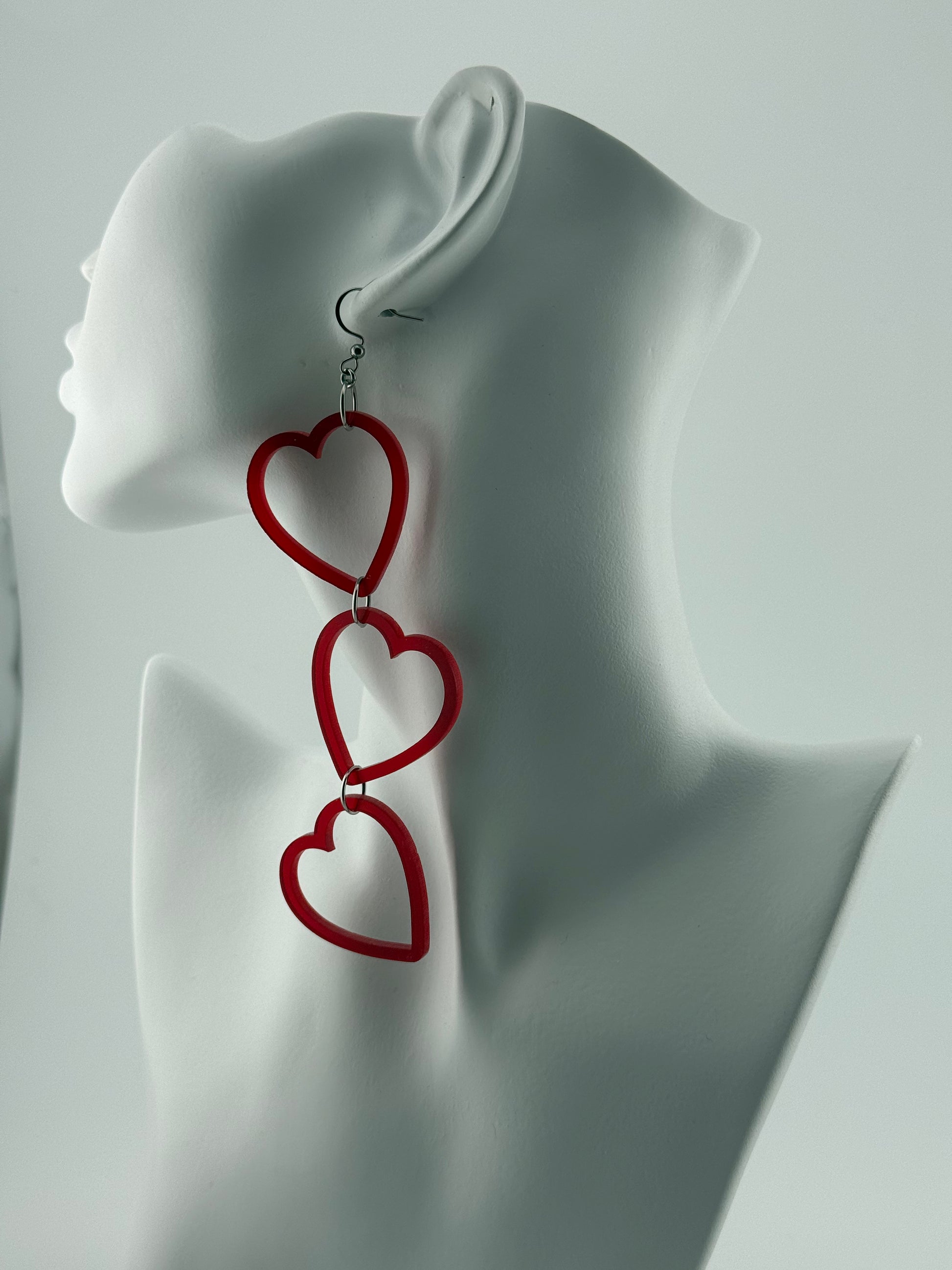 Clean, bold, and rhythmically stacked — three sleek red acrylic hearts cascade in a modern linear drop. The open-heart design keeps them very lightweight while giving a striking, graphic silhouette that moves fluidly with every step. Minimal, glossy, and unapologetically romantic they’re simple at first glance, statement the second you notice them.