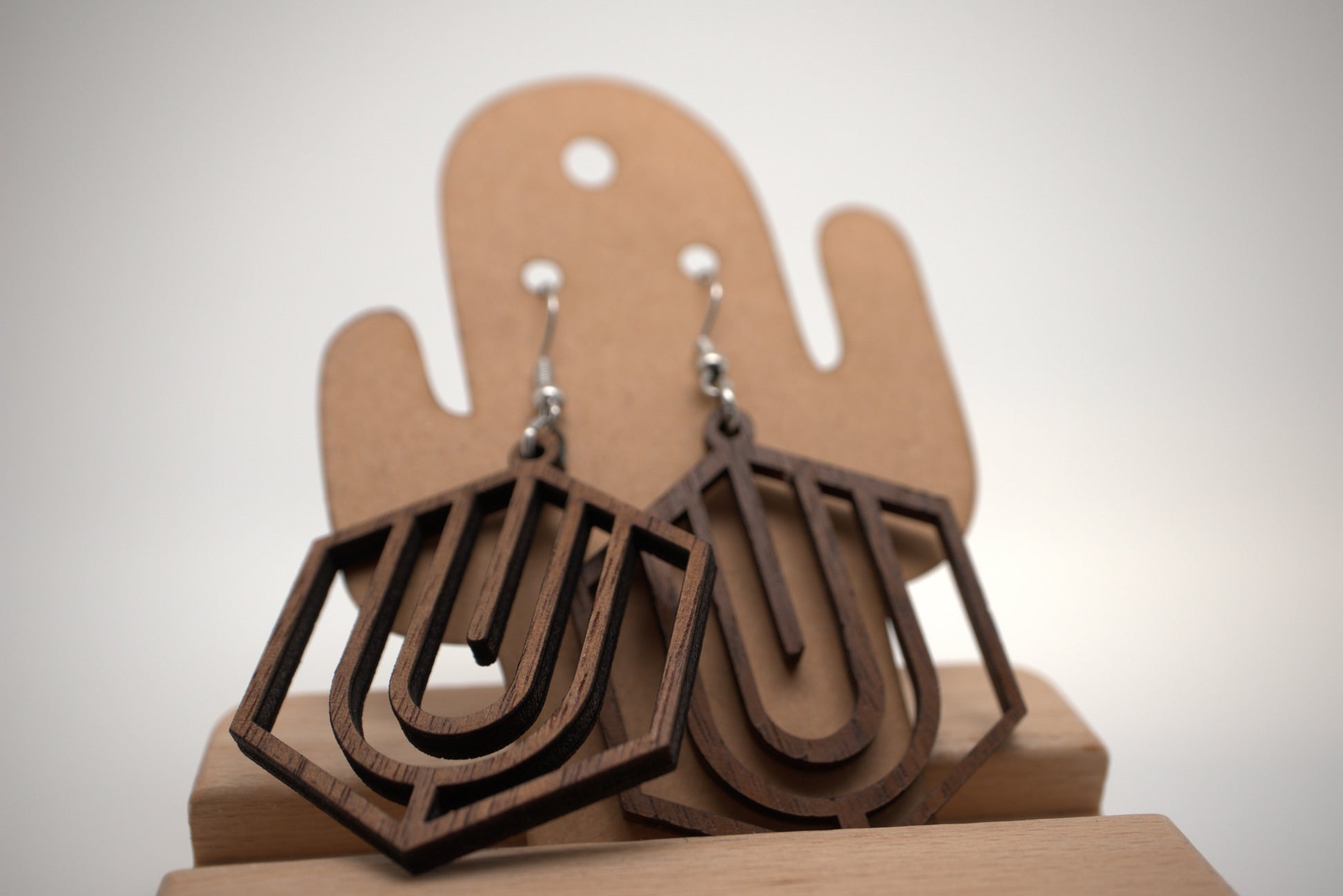 Dynamic, modern, and full of rhythm — the “Pulse” earrings feature a flowing U-form nested within a hexagonal frame. Precision-cut from rich natural wood, the layered design evokes motion and energy while keeping an organic warmth. These earrings make a striking statement — effortlessly balancing structure and fluidity.